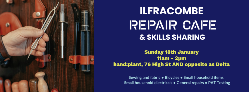 ![]() ![]() Join us on Sunday 18th January, 11am-2pm for the first Ilfracombe Repair Cafe of 2026. Bring your broken bits, snagged seams, or wobbly chairs, and our amazing volunteers will help give them a new lease of life. Bring along items that need some attention to either hand:plant or Delta Ilfracombe, on the High Street. Clothing, […] |
